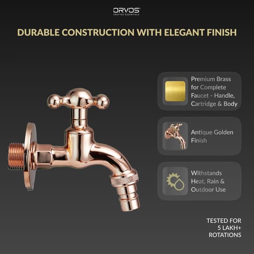 Elevate your outdoor space with the timeless elegance. Crafted for durability and style, this faucet combines superior quality materials with a beautiful, antique design that is perfect for those with a classic taste. Built from Solid Brass, Made to Last This tap is constructed from 100% brass—including the body, handle, and cartridge—for unmatched strength and rust resistance. The durable antique finish is specially designed to withstand high temperatures and heavy rains, ensuring it maintains its stunning look year after year.